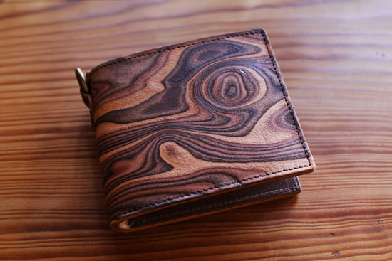 スキモレザーという熟練した革職人の手作業による製法の為、一枚一枚の表情が微妙に異なる木目調の二つ折り革財布が入荷しました☆