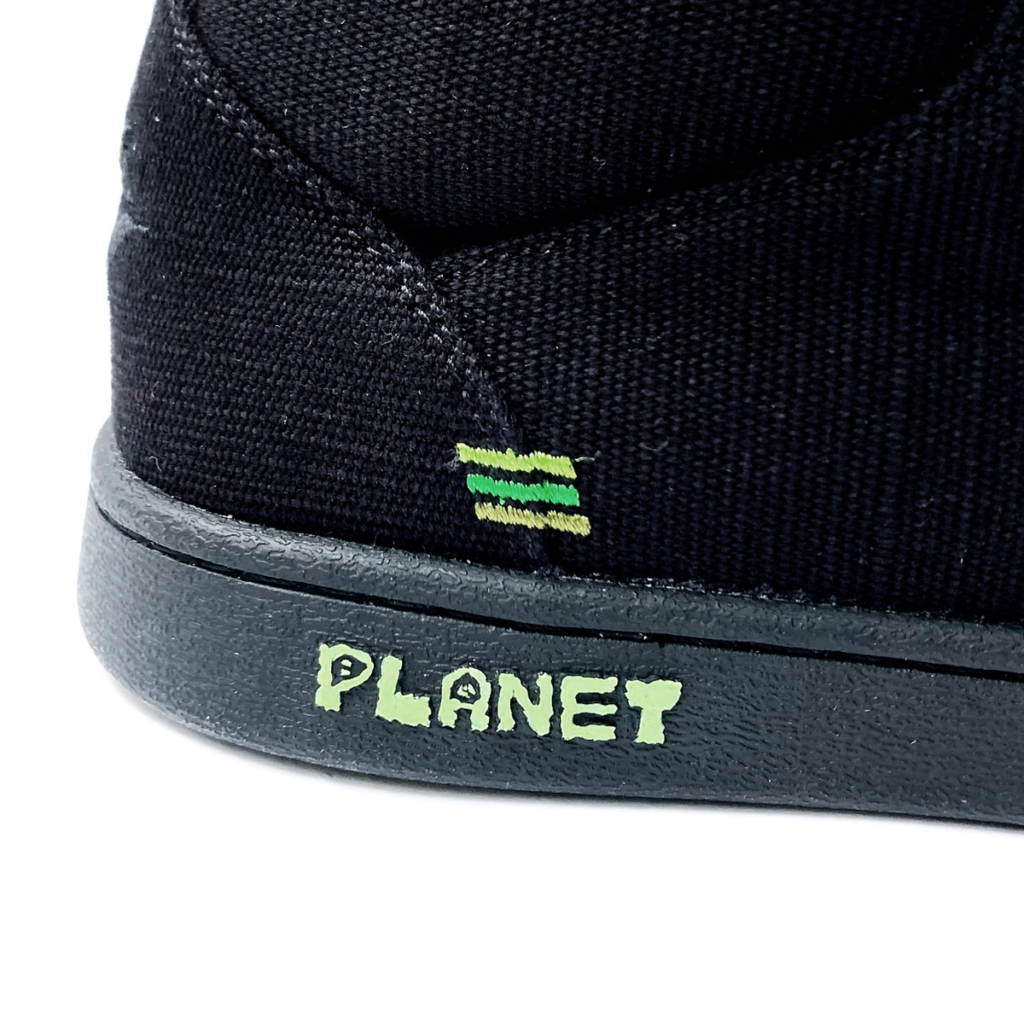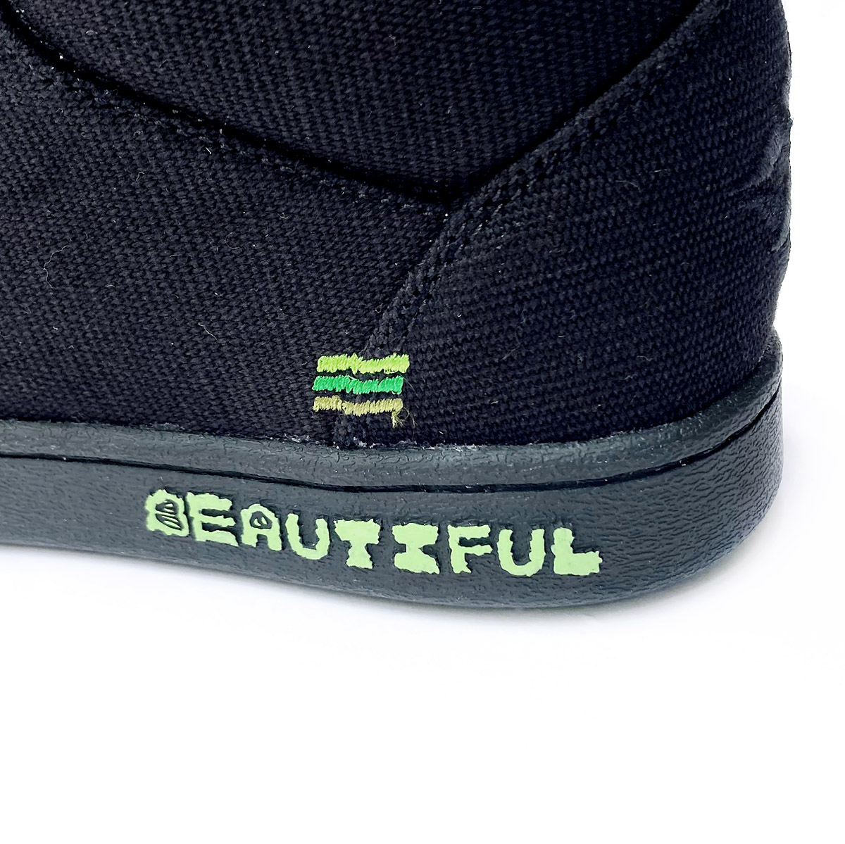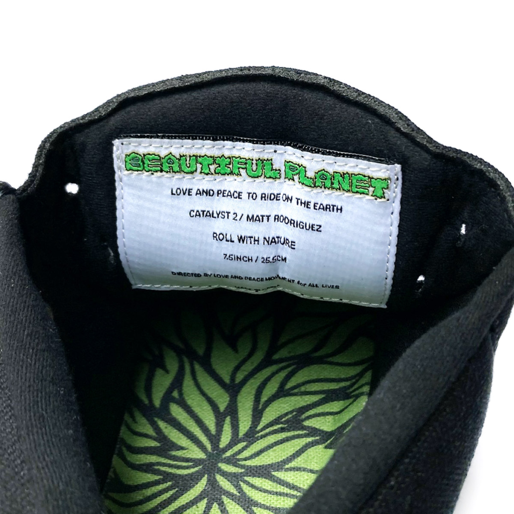 今回の3色ラスタステッチはグリーングラデーション。BIG FOOTがデザインした BEAUTIFUL PLANET のロゴとソールのリーフパターングラフィックがブラックのアウトソールにグリーン色で映えます。