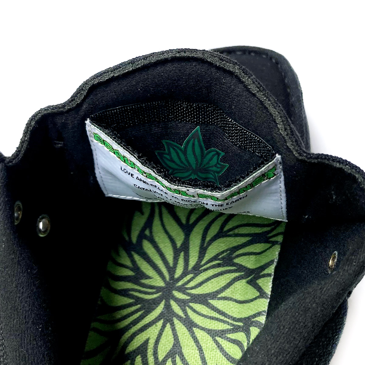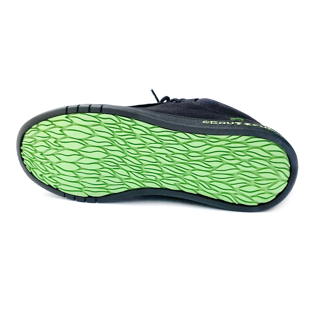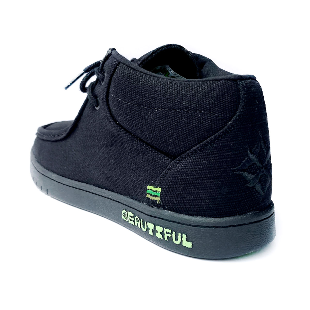 今回の3色ラスタステッチはグリーングラデーション。BIG FOOTがデザインした BEAUTIFUL PLANET のロゴとソールのリーフパターングラフィックがブラックのアウトソールにグリーン色で映えます。