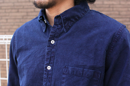 定番のフラットシャツにインディゴ染めが施された独特な風合いとスタンダードな細みのシルエットです。