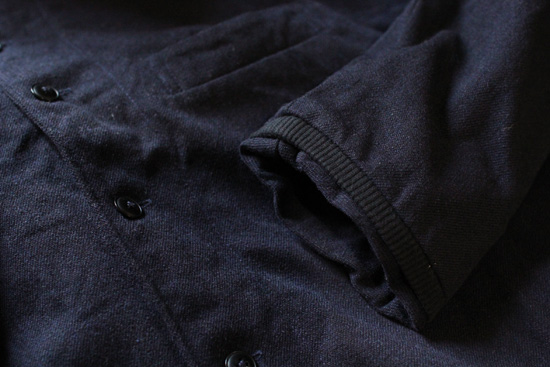 どことなくPコートのような雰囲気もありつつそれを少し崩した、裾や袖口・衿の内側の生地がはみ出たような作り。