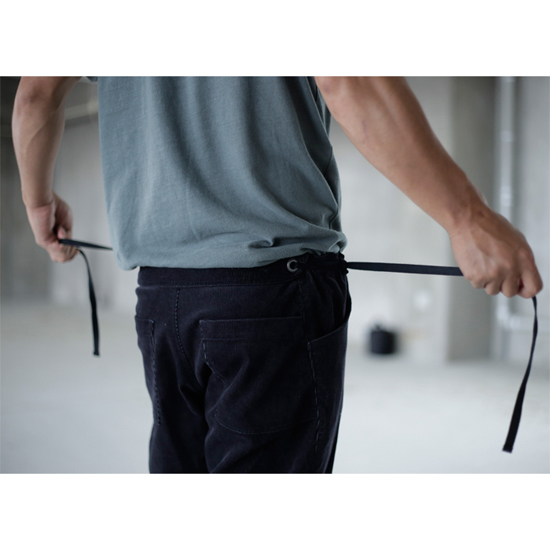 ゆったりめシルエットな9.5分丈コーデュロイパンツ。それだけでも独特でかっこよいのですが、最大の特徴は腰ひも。
