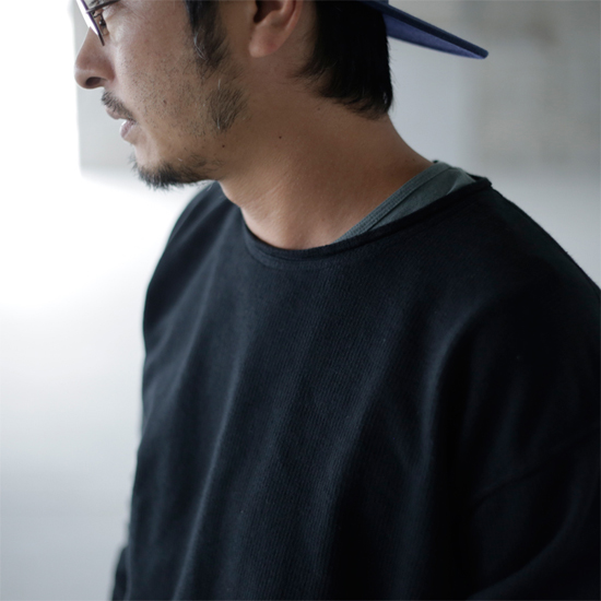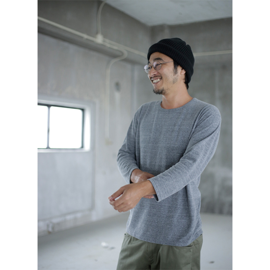 形がスウェットにも似た着回しの効く、しっかりとした素材の独特なカットソー。襟口、袖、裾がロールアップした形状です。