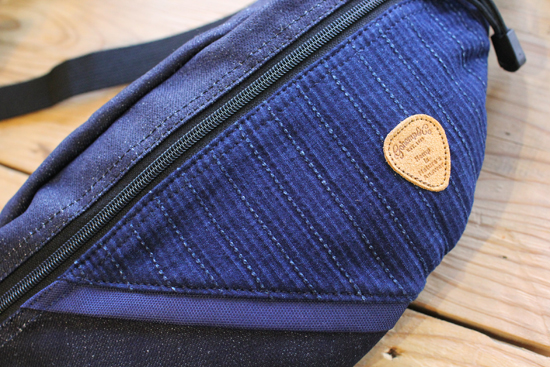 岡山は備後地方で力織機を使用して織り上げられたヘンプオーガニックコットンのセルヴィッチデニムと、インディゴ刺し子で切り替えたアイテム。ピック型の革パッチもアクセントに。