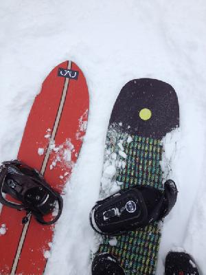 一緒に行ったスノーボードが4シーズン目で初ゲンテンの妻はFLYING CARPET(↓左)。もともと硬い緩斜面で逆エッジになるのが相当恐ろしいらしく、でもゲンテンのコンベックス形状のおかげでその不安がなくなり、エッジの引っかかりがなくなってターンもスムーズになったとのこと。あとはパウダーでの浮力を感じれたと生意気なことを言っておりました。