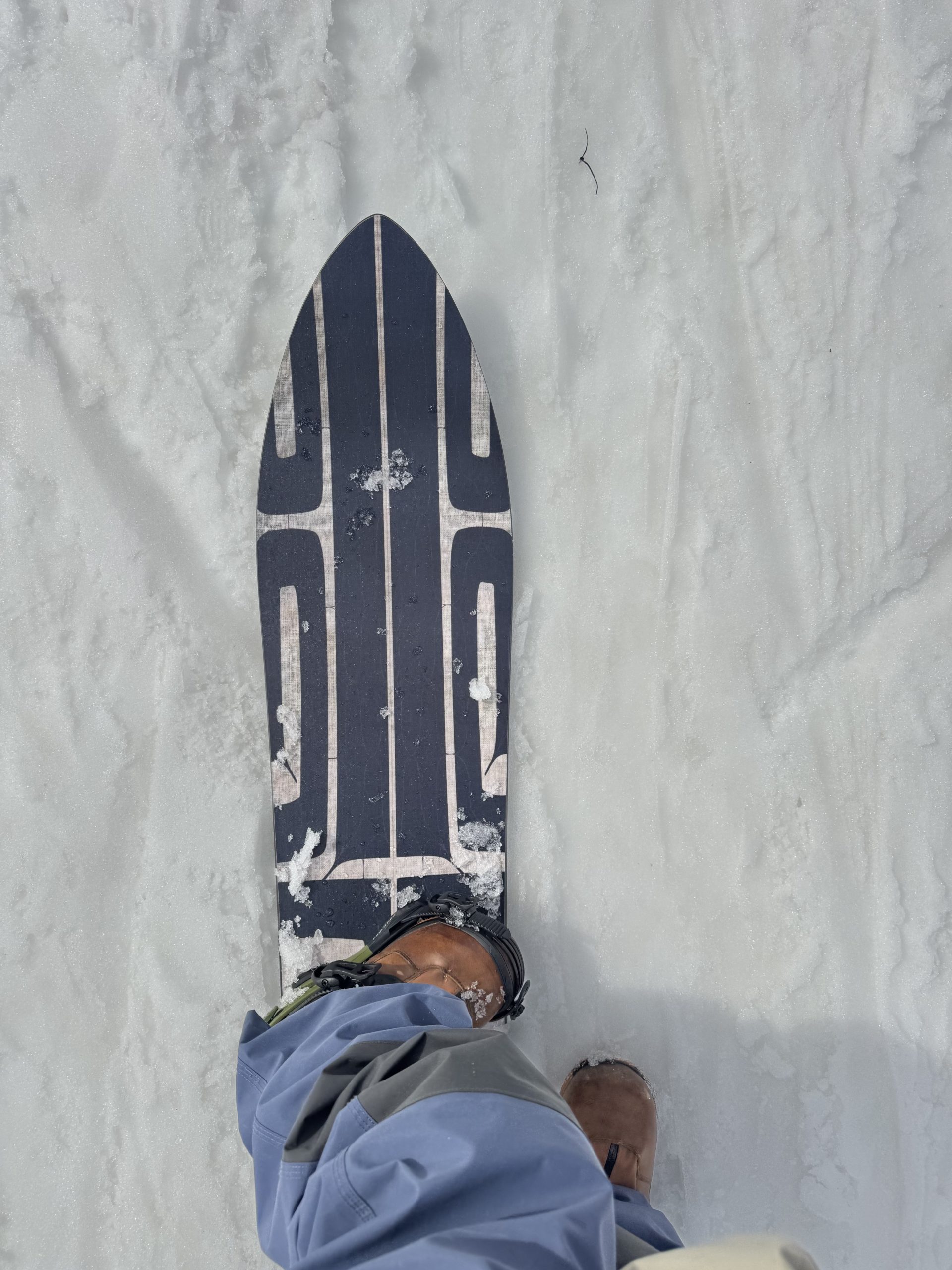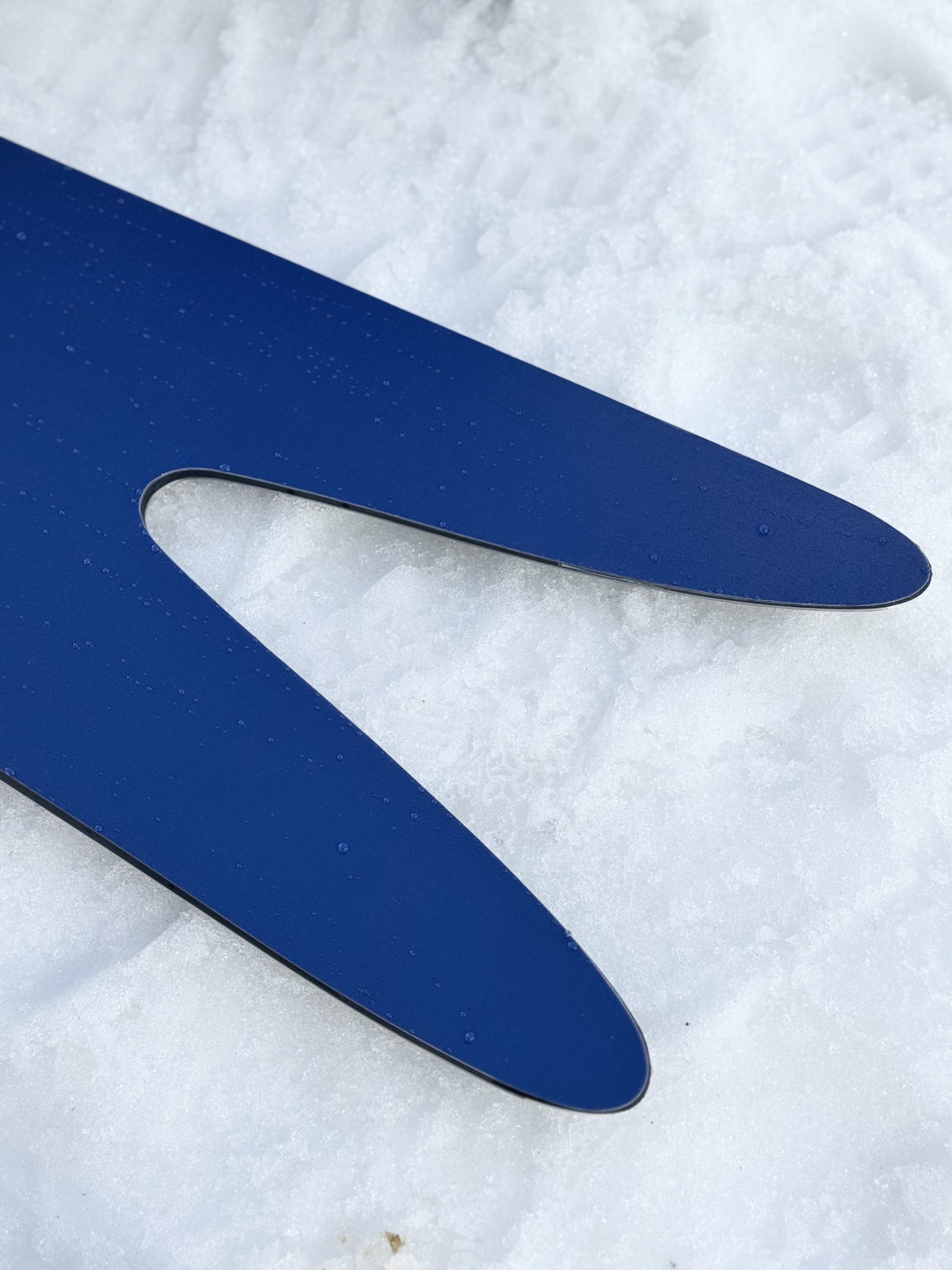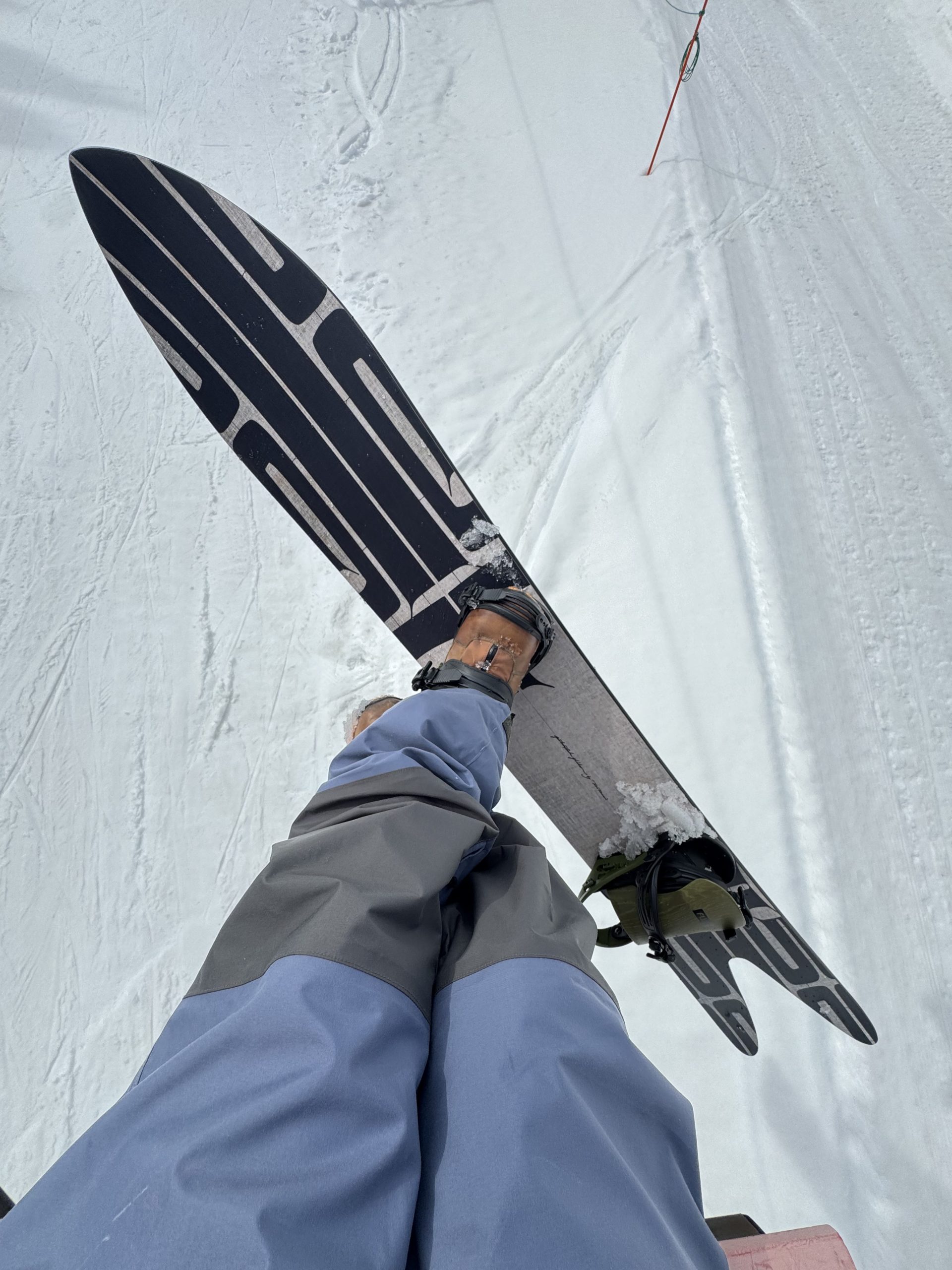 エッジが短く太いのが特徴なので硬い雪では辛い時がありますが、こんな春雪には実は最高で、太い幅で倒し込んでも足に雪が当たらないので減速しない、エッジは全然抜けない、良く動く。