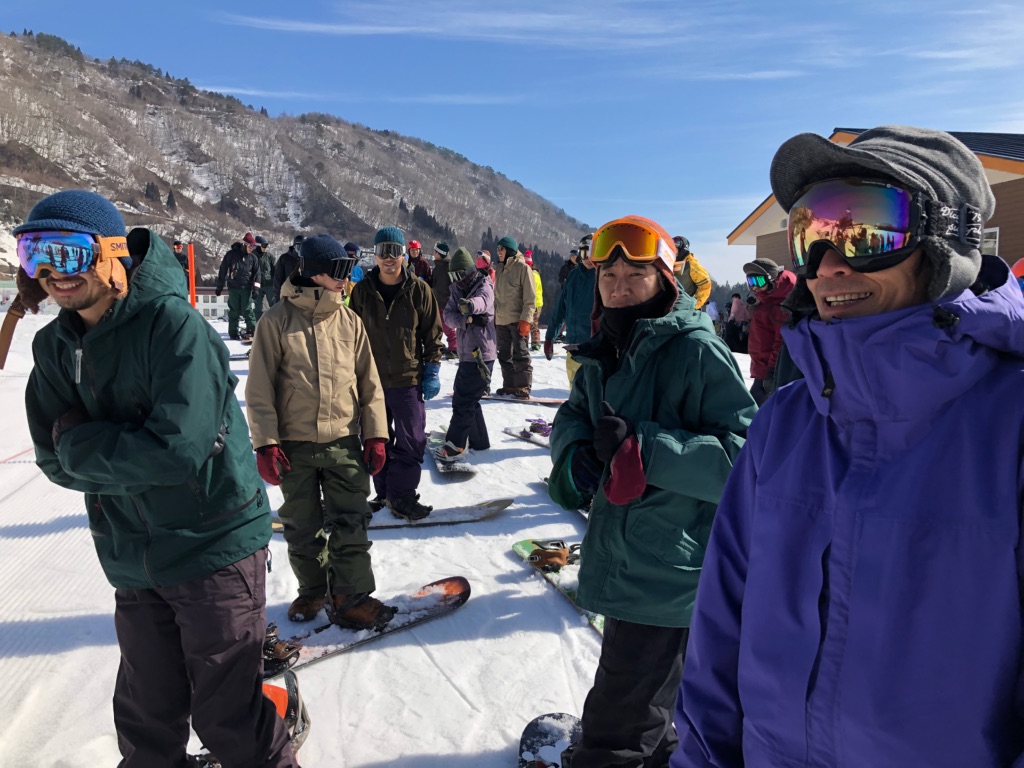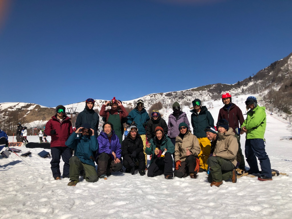 集まったスキモノは20人以上。ほぼ全員が新旧GREENCLOTHING。グリーンのウエアのこの雪山での存在感は、田口さんが作る色とシルエット。そして使いやすさが最高なのです。