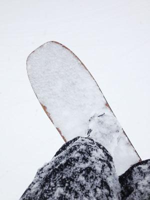 パウダーで加速するというテールのバレル↓も体感したかったのですが、底当たりする薄いパウダーでは加速はほとんど感じられず、でもその状況でテールに体重をかけた時にバレルの形状は少し感じることができました。深いパウダーでの加速感、是非感じてみたいです。